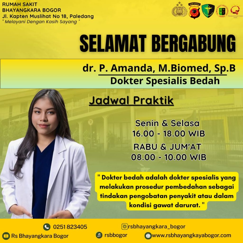 September 2, 2025 Muhammad Redy SELAMAT BERGABUNG DOKTER SPESIALIS BEDAH dr. P. AMANDA, M.Biomed, Sp.B di RUMAH SAKIT BHAYANGKARA TK IV BOGOR